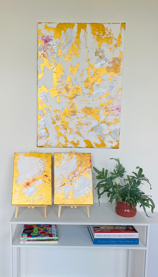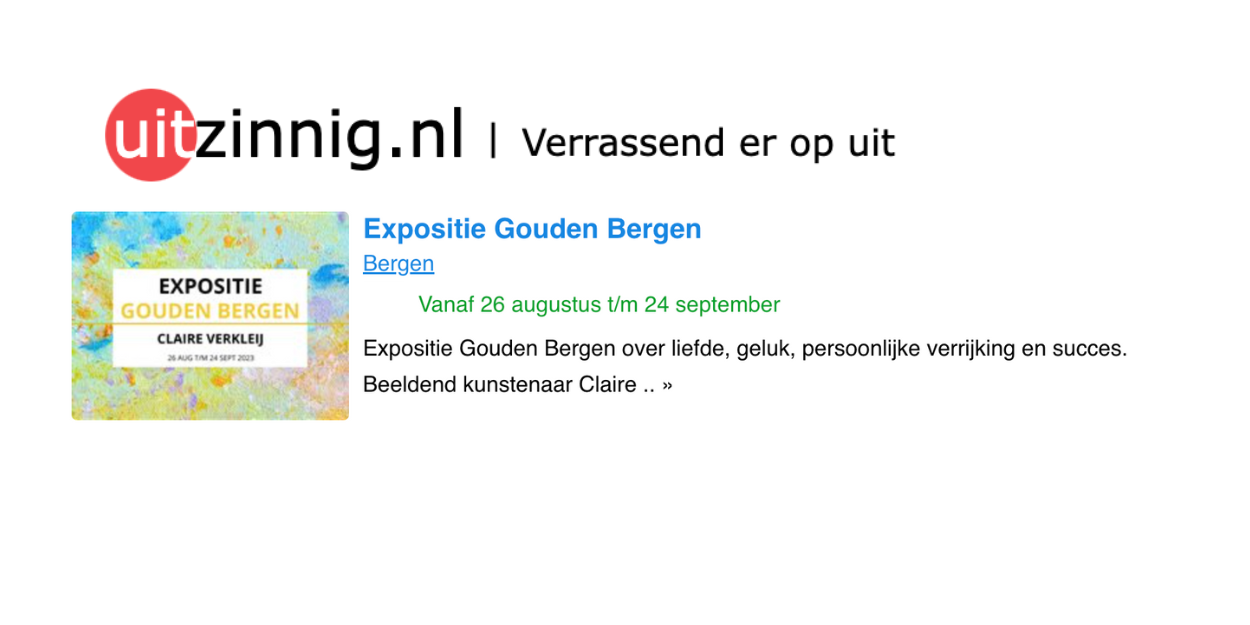 Visual artist Claire Verkleij of Let The Colors Speak has been inspired for this exhibition by the themes of love, happiness, personal enrichment and success. How do you find the way to your own golden happiness? How do you get to your golden mountain? Do you have everything you've longed for? When are you happy and what does happiness, love and success mean? And what is the optimal balance? These questions inspired Claire to create the exhibition 'Gouden Bergen'.